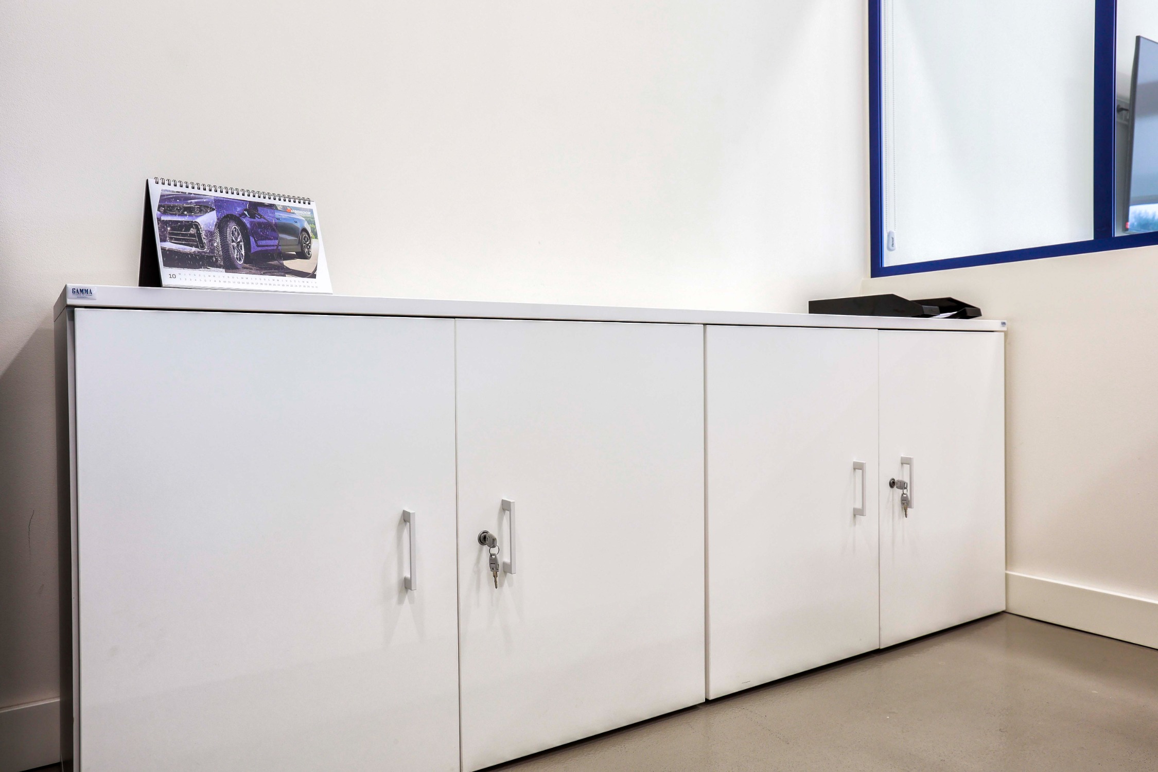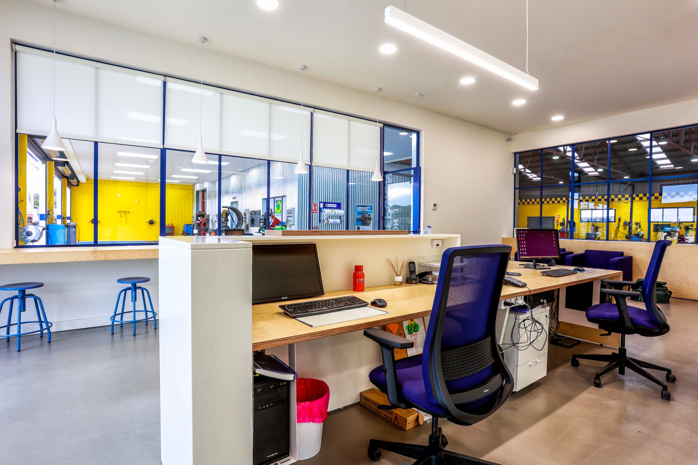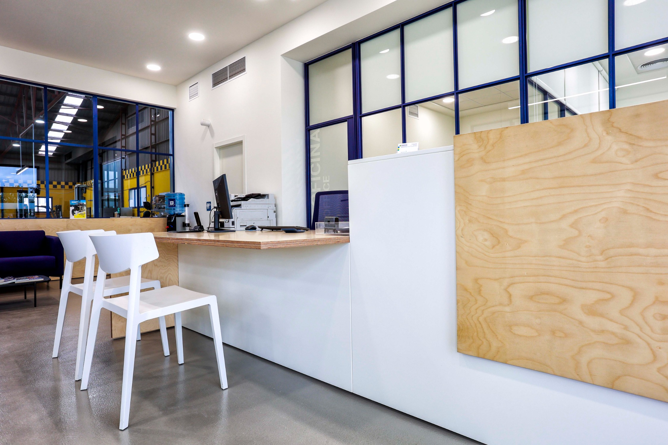 El proyecto abarcó la zona de recepción y de oficinas del taller, donde se priorizó una distribución eficiente equipada con mesas de trabajo, cajoneras y sillería ergonómica para garantizar el máximo confort del equipo durante su jornada laboral.