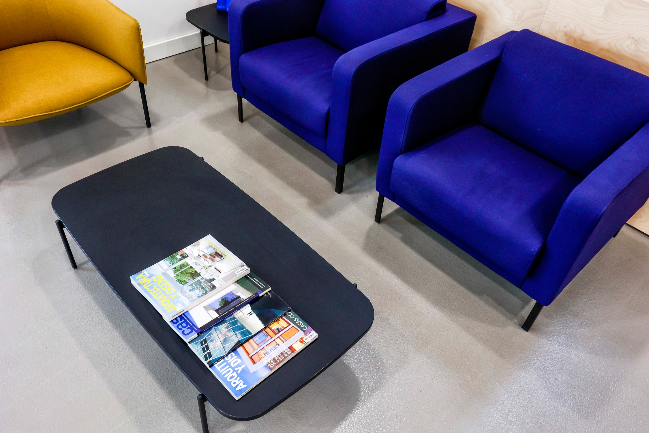 Uno de los espacios más destacados es la sala de espera para clientes protagonizada por los sofás Marina y Quadrat y por una barra de conexión equipada con enchufes y puertos USB, y el exclusivo set de taburetes Nexos. También se habilitó una zona office con sillas Wing y pufs, pensada como un espacio cómodo y funcional para las pausas diarias del equipo.